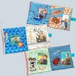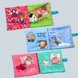 Stoff-Bilderbuch als Geschenk zur Taufe mit vielen bunten Seiten und Fotos zur Erinnerung an Großeltern, Eltern, Tanten und Onkel